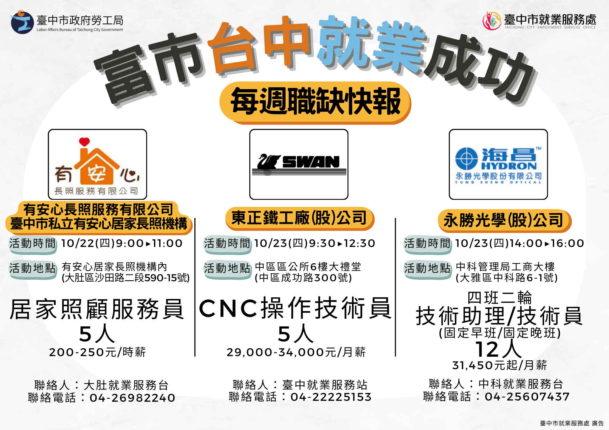 職缺快報1023 「臺中市政府職缺快報來囉!10/21-10/23邀請有安心長照、東正鐵工廠、永勝光學等廠商,辦理5場徵才,提供276個職缺,查詢更多職缺資訊:https://gov.tw/XJo,請洽04-22289111轉36100洽詢。」