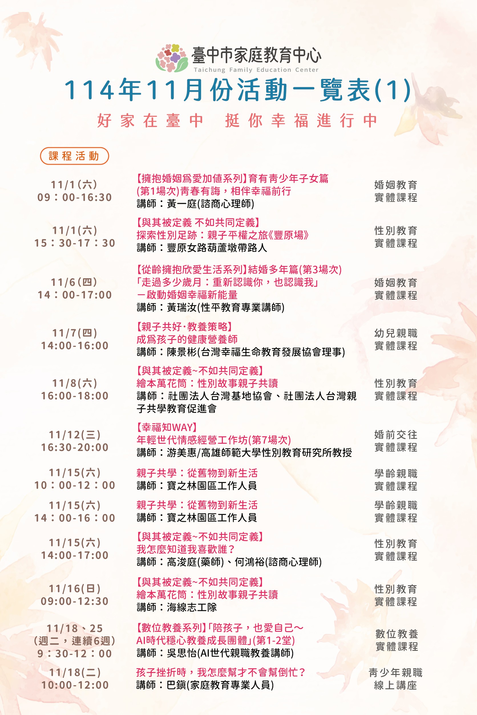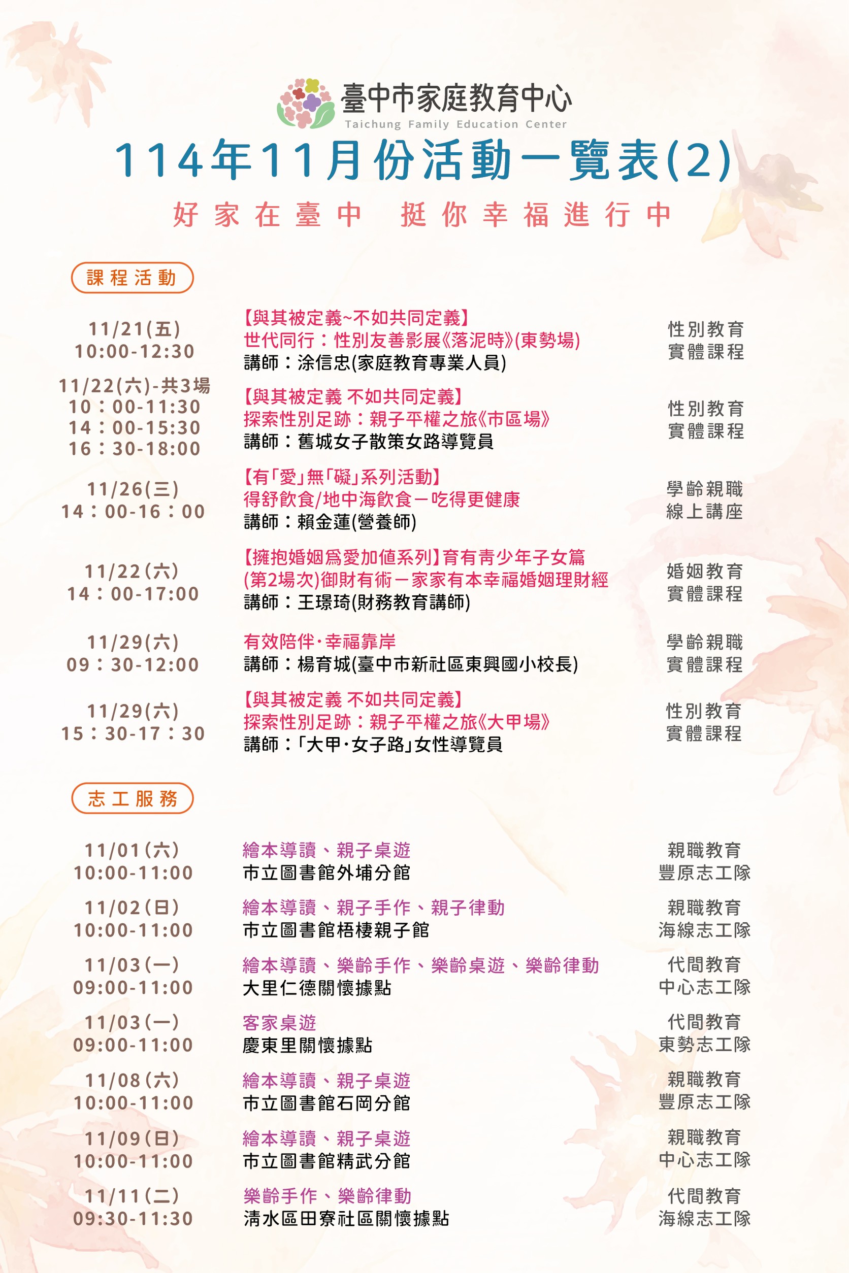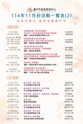 轉知臺中市家庭教育中心114年11月份活動相關資訊