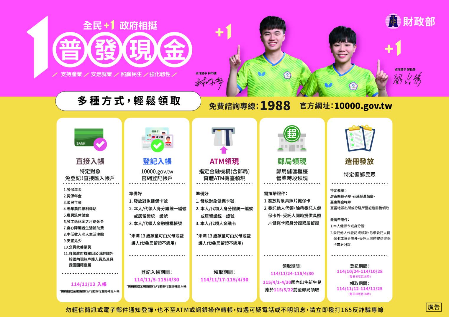 全民+1 政府相挺」普發現金發放作業自114年10月23日起正式啟動,財政部為使民眾瞭解普發現金領取方式,已建置普發現金網站(網址:https://10000.gov.tw),以供民眾查看相關資訊。