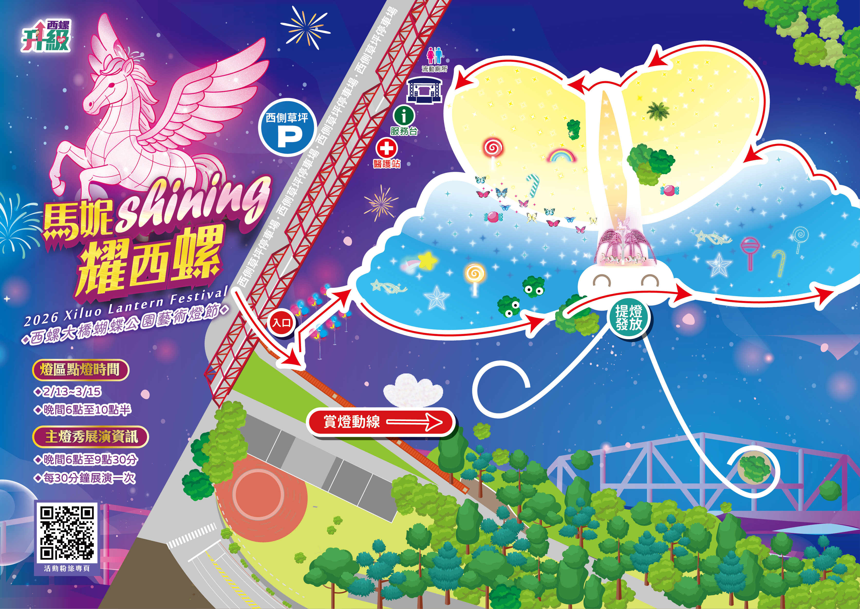一、旨揭活動以「馬妮shining耀西螺」,融合生肖文化、遊樂園童趣與光影藝術,打造一場跨世代共感的燈節盛典,主燈以翱翔飛馬為造型,高約9米的大型主燈隨音樂變換流光溢彩的燈光特效,下方環繞旋轉木馬燈組,勾勒出童話般的場景,新春期間歡迎大家來西螺走春,白天遊老街、吃美食,晚上來蝴蝶公園走走,帶領大家穿越想像的邊界,打造夢幻的光影嘉年華!