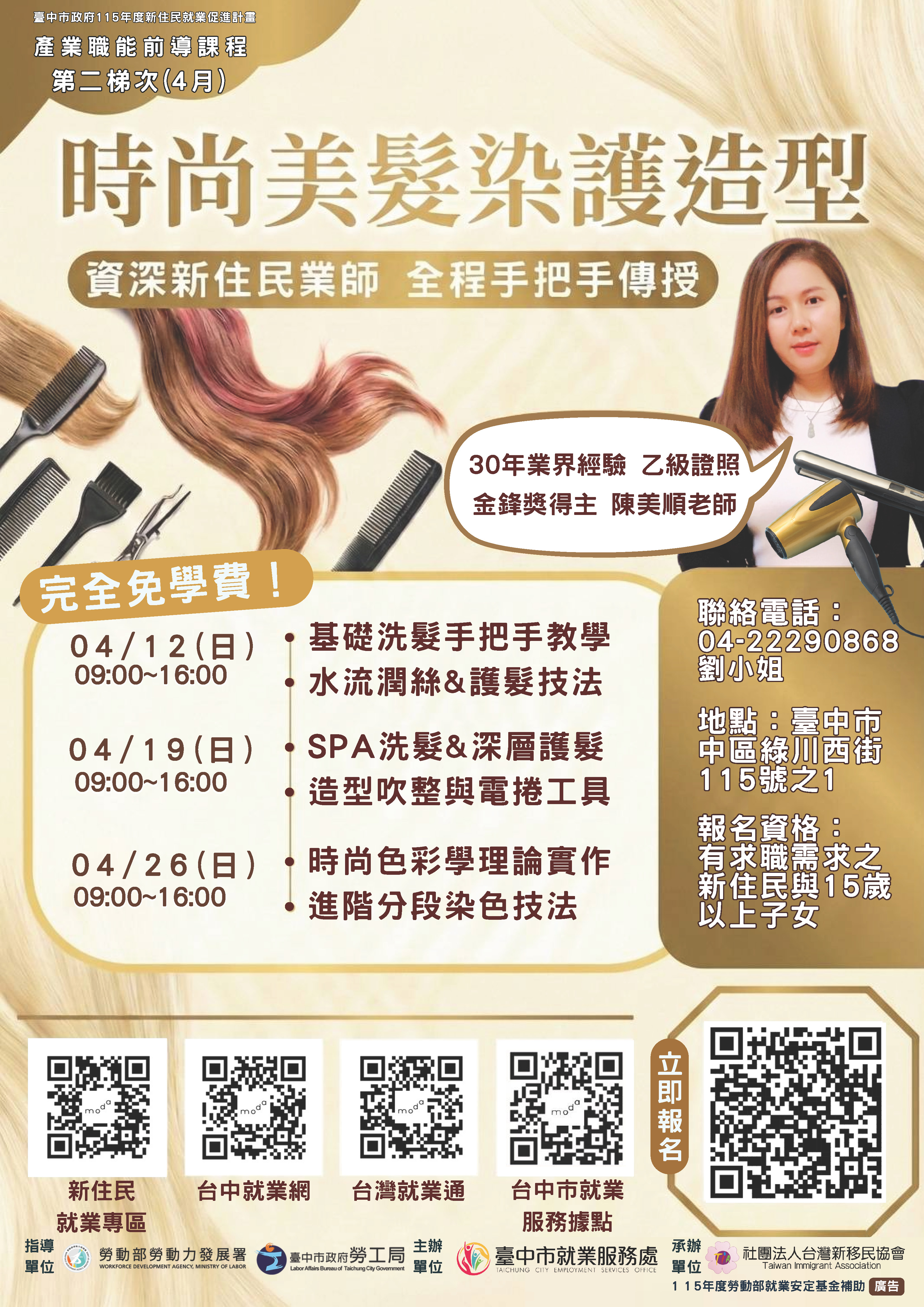 臺中市就業服務處委託社團法人台灣新移民協會辦理「時尚美髮染護造型前導班」職能前導課程