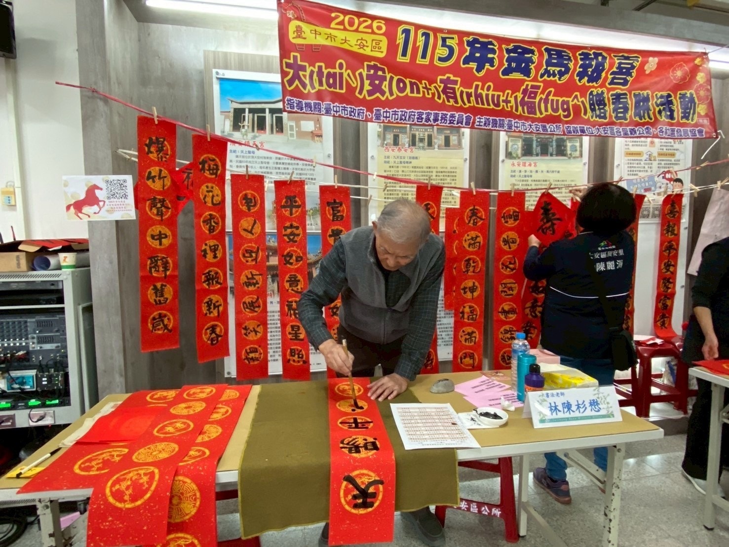 為迎接丙午馬年,臺中市政府客家事務委員會與大安區公所今日(1/31)舉辦「115年金馬報喜 大安有福贈春聯活動」。現場集結8位書法名師揮毫、客家藝文表演及手作體驗,並安排客家藝文表演,讓海線民眾有機會體驗客家多元文化,吸引大批民眾共襄盛舉。