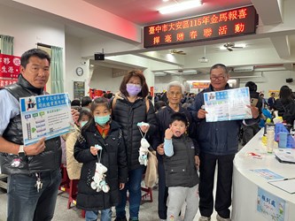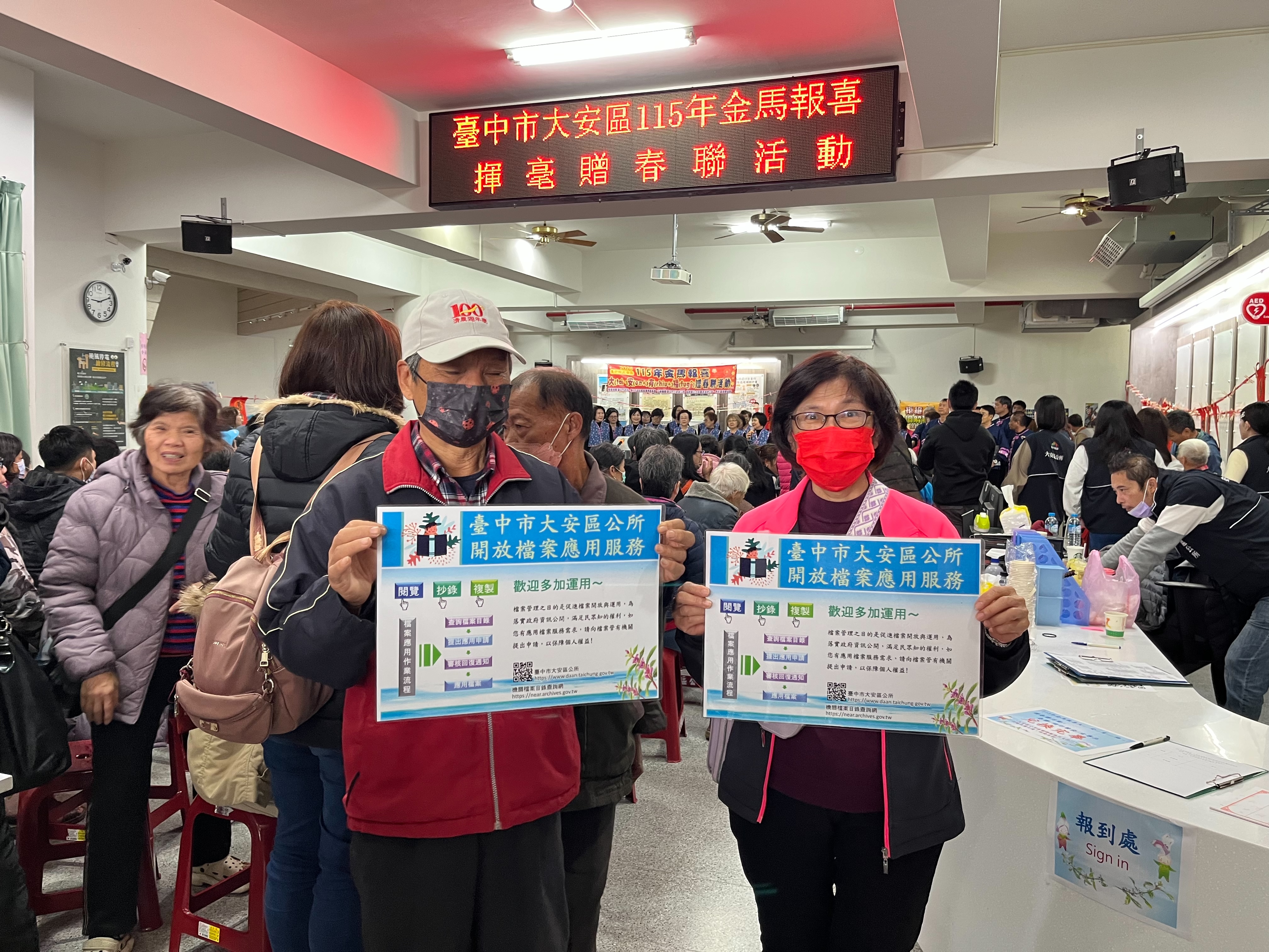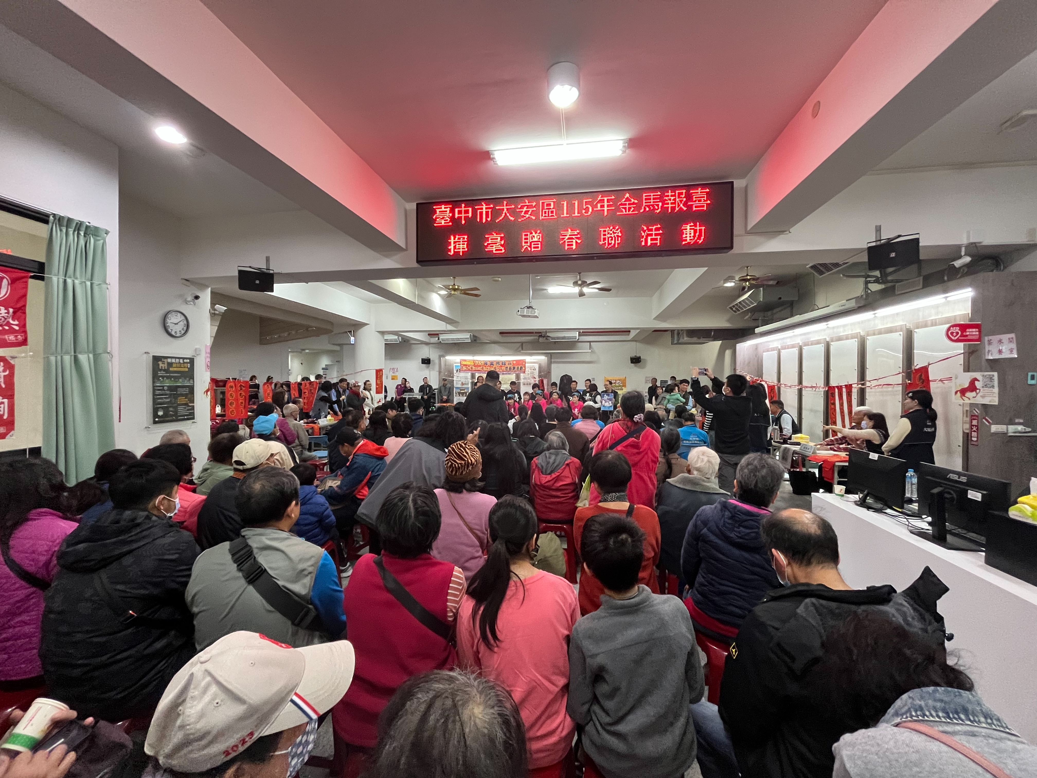 本次活動邀請8位書法名家現場書寫獨特春聯,由「大安長青學苑運動舞蹈班」與「香頌合唱團」熱力開場。許宏綺區長特別在活動中同步宣傳 2026 中台灣燈會,今年首度攜手國際知名 IP「姆明一族,以「幸福蜜馬・臺中 MOOMIN ON!」為主題,將於 2 月 15 日至 3 月 3 日在中央公園盛大展出,誠摯邀請市民朋友,一同走進燈會現場,感受臺中滿滿的幸福能量與城市溫度,活動期間區長市政宣導:2025臺中購物節開跑及宣導本所已開放檔案應用服務,歡迎大家多多利用。